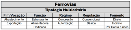 Os diversos atributos caracterizam a malha ou trecho em relação a: a) Fim/Vocação: Sua finalidade dominante (mercado interno ou exterior); b) Função: Sua relação com os demais trechos ou malhas. Ou seja, na rede/sistema ferroviário brasileira; c) Regime: Forma pela qual é outorgada pelo poder concedente; d) Regulação: Nível de normas e instrumentos aplicáveis; e) Fomento: Forma de eventual participação de instrumentos e/ou recurso públicos: direto, se elegível para recursos dos tesouros (Fonte-100); indireto, se para benefícios fiscais; ou “por conta e risco”.